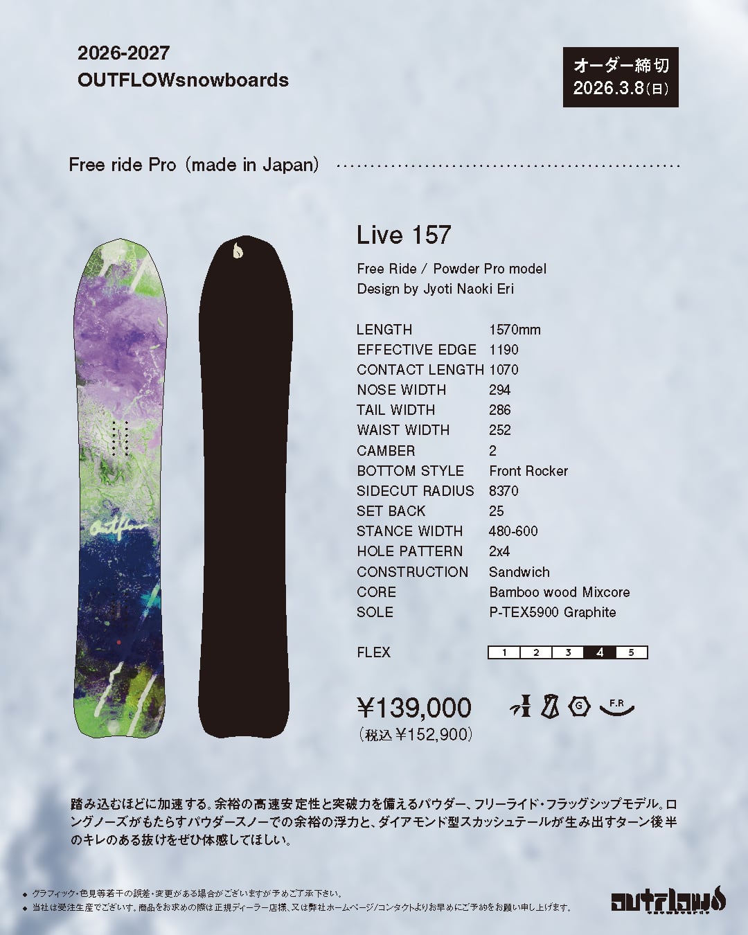 ロングノーズがもたらすパウダースノーでの浮力と、ターン後半のバランスのとれた取り回し感とミディアム・ハードなフレックスが、 キレのある抜けを考慮しダイアモンド・スカッシュテールを配置。 余裕の安定感と走破性を提供します。 最高の突破力を備え、フリースタイルからパウダーフリーライドを ボーダレスに横断する、OUTFLOWのフラッグシップモデルです。