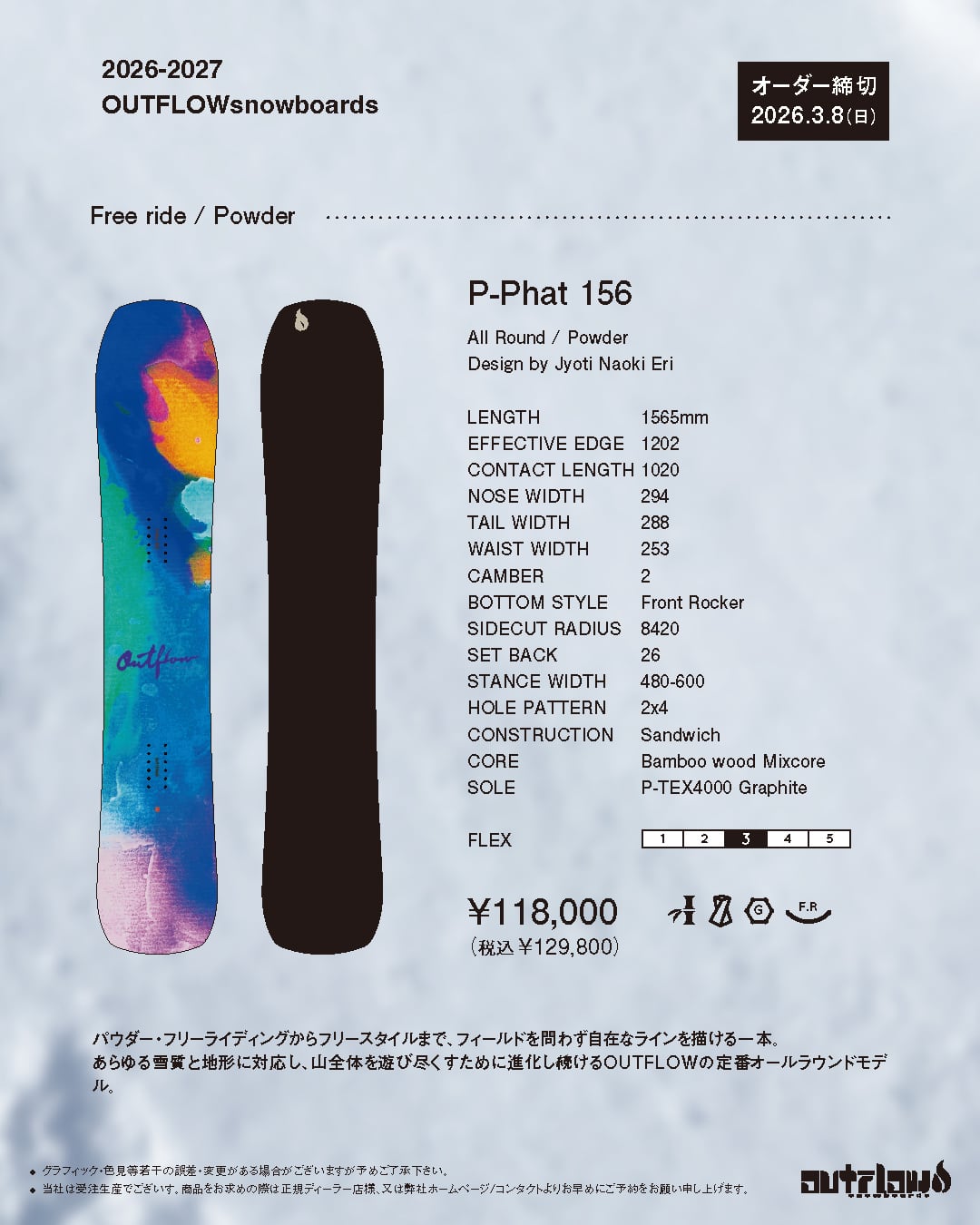 あなたをネクストスクールへと誘う第二世代ファットモデル。 リニューアルしたボトムラインとノーズ&テールキックによりパウ ダースノーでのスムーズな浮力を獲得。